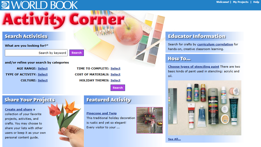 A fun site from Worldbook that features thousands of creative projects and crafts suitable for a wide variety of ages. Whether you are looking for an easy Halloween decoration to create with a three-year-old at home, a teacher searching for an educational craft project for the classroom, or a creative adult seeking a Christmas wreath that you can make yourself, you will find it in Activity Corner.