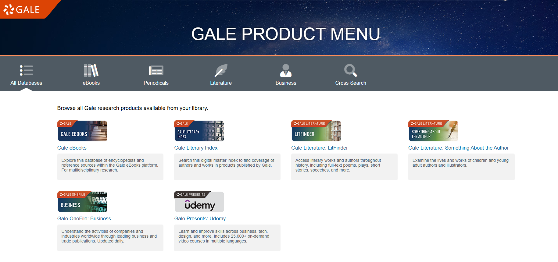 A collection of over 4,000 online research books from publisher Gale. The online research book collection provides information that has been researched and evaluated by top scholars in their fields.